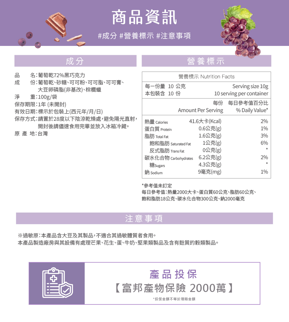 產品成分成分:葡萄乾、砂糖、可可粉、可可脂、可可膏、大豆卵磷脂(非基改)、棕櫚蠟