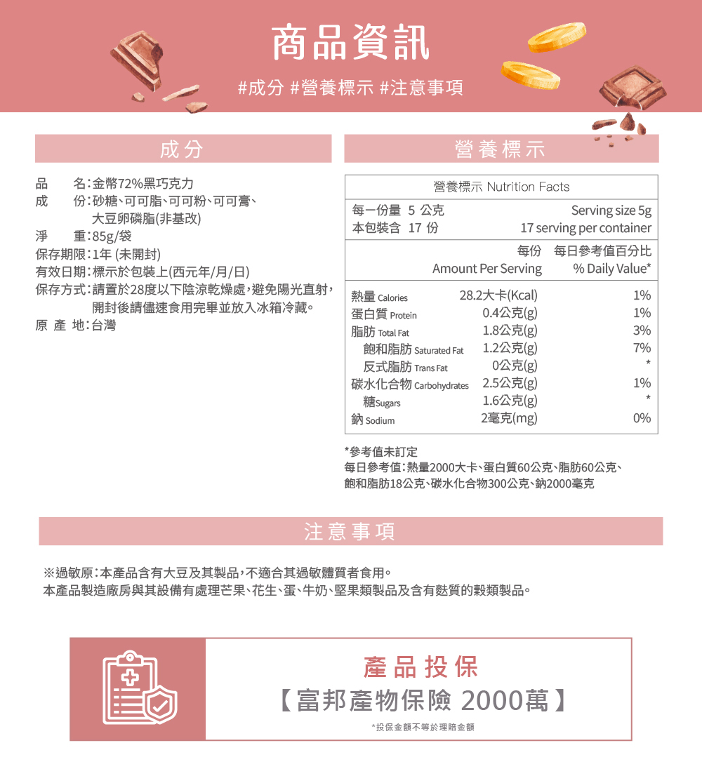 產品成分成分:砂糖、可可脂、可可粉、可可膏、大豆卵磷脂(非基改)