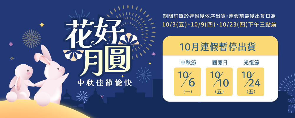 為因應2025年10月連續假期 10/04(六)-10/06(一)暫停出貨&暫停客服 10/10(五)-10/12(日)暫停出貨&暫停客服 10/24(五)-10/26(日)暫停出貨&暫停客服 期間官網仍可正常下訂單 暫停出貨期間訂單將於連假後依序處理出貨