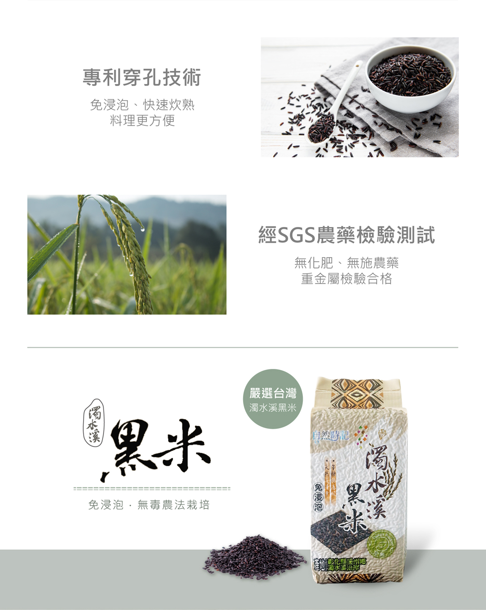 。濁水溪黑米:黑米採專利穿孔技術免浸泡即可烹煮出香、Q、軟的迷人口感