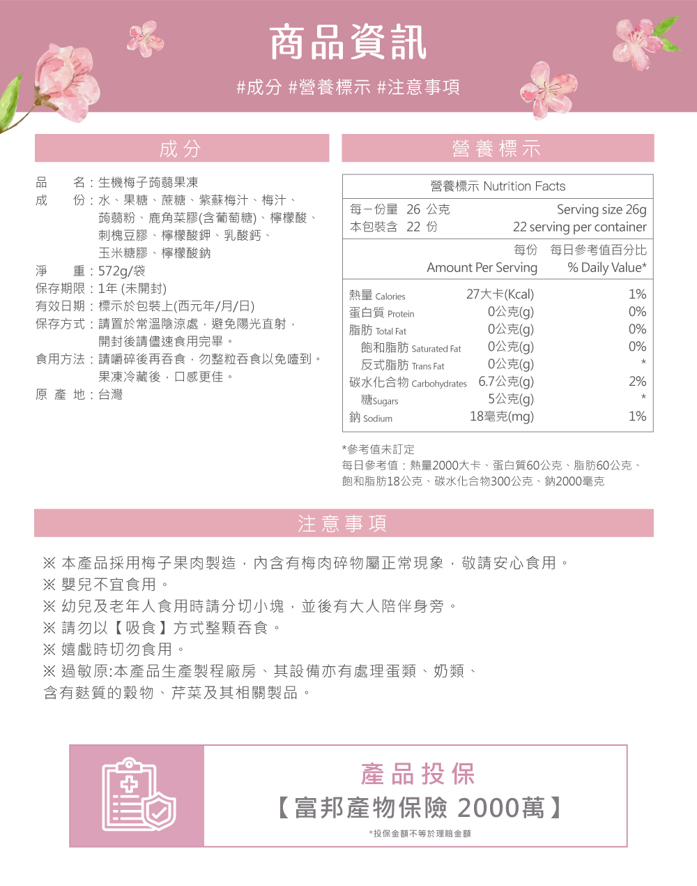 產品成分成分:水、果糖、蔗糖、紫蘇梅汁、梅汁、蒟蒻粉、鹿角菜膠(含葡萄糖)、檸檬酸、刺槐豆膠、檸檬酸鉀、乳酸鈣、玉米糖膠、檸檬酸鈉